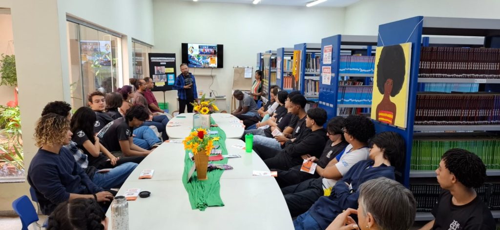 A palestra começou de forma musical, com o professor André Goveia cantando, junto aos estudantes, a canção “Negro Nagô”, criando um clima de acolhimento e envolvimento. Em seguida, o escritor compartilhou sua trajetória de vida, desde a infância marcada pelo incentivo da mãe, passando pelo apoio da professora e escritora Irma Galhardo durante o Ensino Médio, até a consolidação como escritor inspirado por grandes mestres como Zacarias Martins.