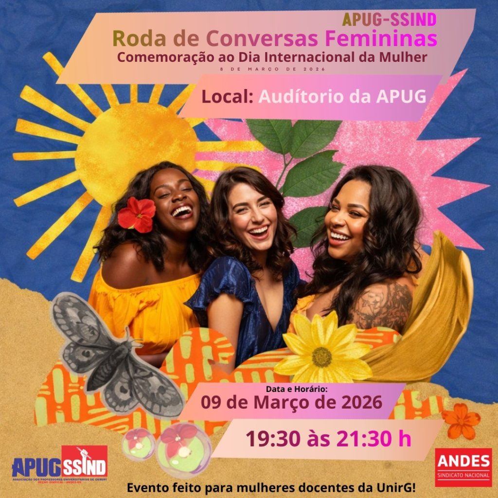 Em alusão ao Dia Internacional da Mulher, celebrado mundialmente em 8 de março, a Associação dos Professores Universitários de Gurupi – ApugSsind realizará, no próximo dia 09 de março, segunda-feira, das 19h30 às 21h30, no auditório Laudete Aires Pereira, na sede da entidade, a Roda de Conversas Femininas, reunindo mulheres docentes da Universidade e convidadas, para um momento de diálogo, reflexão, valorização e celebração.