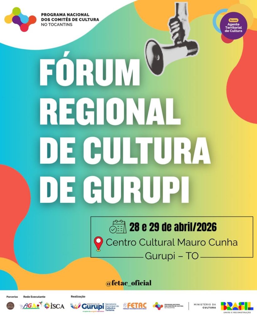 Gurupi sediará, nesta terça-feira, 28, e quarta-feira, 29, o Fórum Regional de Cultura de Gurupi 2026. O evento reunirá artistas, agentes culturais e a comunidade em geral para um momento de escuta, diálogo e construção coletiva de propostas para o fortalecimento das políticas culturais no município e na região.